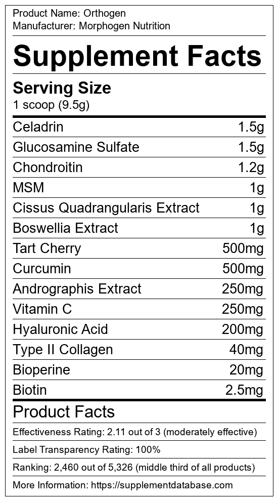 Orthogen is a joint supplement manufactured by Morphogen Nutrition. It ranks 56 out of 99 joint supplements and earned an overall thumbs-down recommendation based on seven factors including nutrition label transparency, ingredients, dosing, claims, research rating, and ranking.