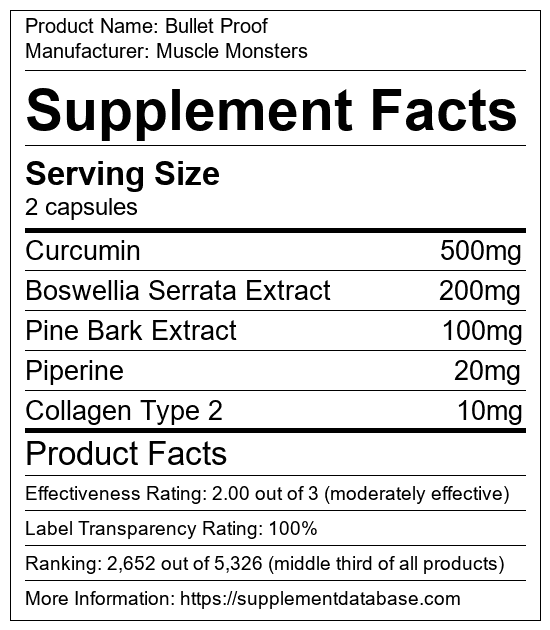 Bullet Proof is a joint supplement manufactured by Muscle Monsters. It ranks 62 out of 99 joint supplements and earned an overall thumbs-down recommendation based on seven factors including nutrition label transparency, ingredients, dosing, claims, research rating, and ranking.