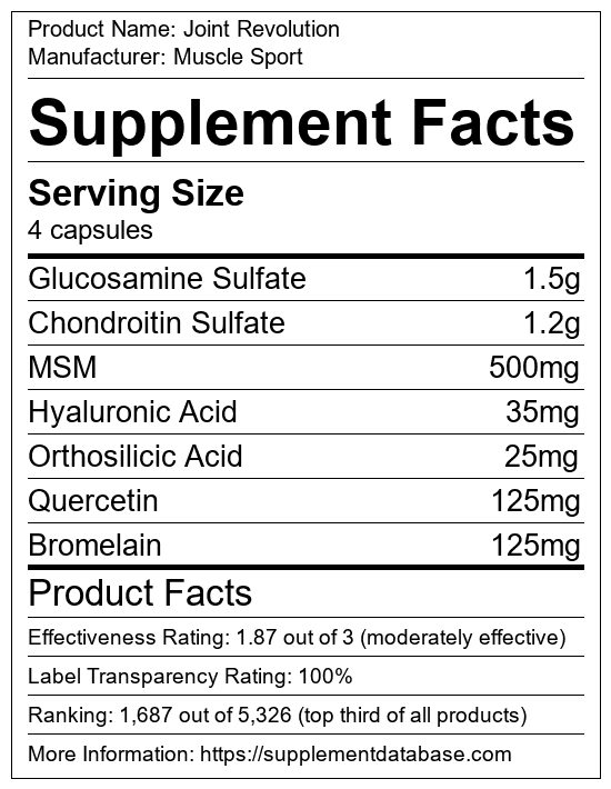 Joint Revolution is a joint supplement manufactured by Muscle Sport. It ranks 40 out of 99 joint supplements and earned an overall thumbs-up recommendation based on seven factors including nutrition label transparency, ingredients, dosing, claims, research rating, and ranking.