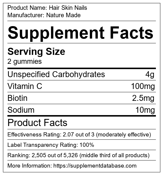 Hair Skin Nails is a multivitamin manufactured by Nature Made. It ranks 14 out of 52 multivitamins and earned an overall thumbs-down recommendation based on seven factors including nutrition label transparency, ingredients, dosing, claims, research rating, and ranking.