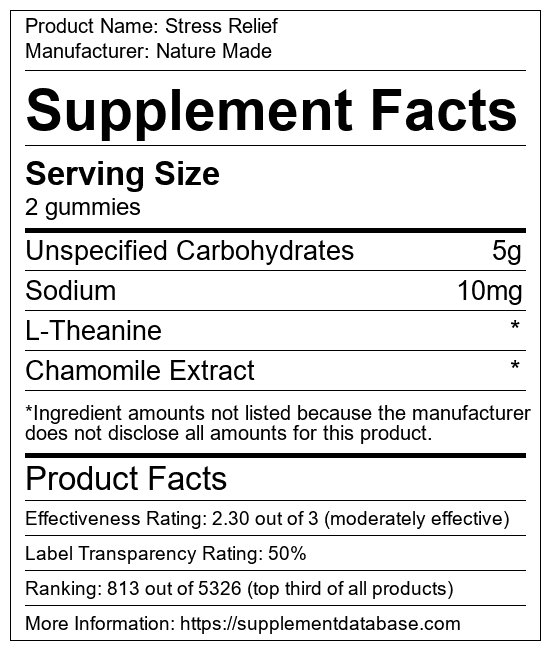 Stress Relief is a mood enhancing supplement manufactured by Nature Made. It ranks 14 out of 43 mood enhancing supplements and earned an overall thumbs-up recommendation based on seven factors including nutrition label transparency, ingredients, dosing, claims, research rating, and ranking.