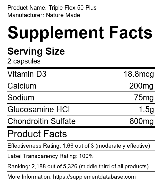 Triple Flex 50 Plus is a joint supplement manufactured by Nature Made. It ranks 42 out of 99 joint supplements and earned an overall thumbs-up recommendation based on seven factors including nutrition label transparency, ingredients, dosing, claims, research rating, and ranking.