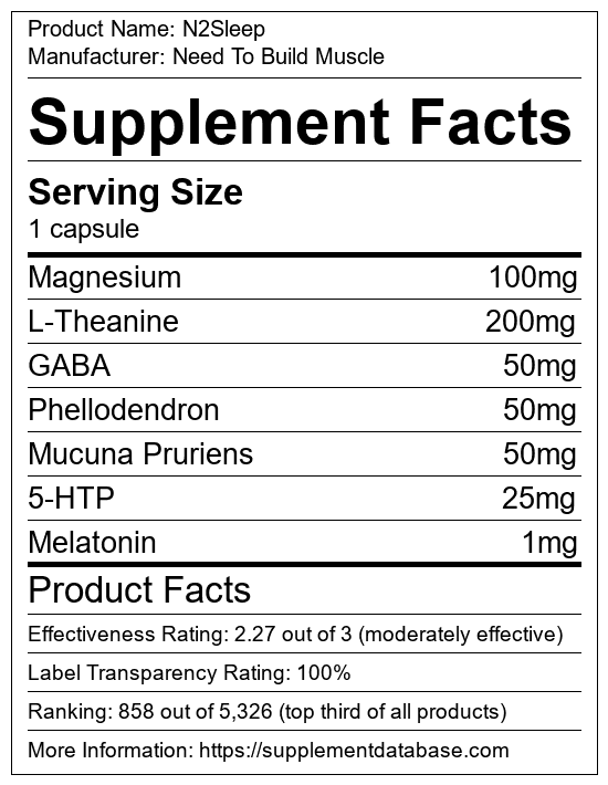 N2Sleep is a sleep aid manufactured by Need To Build Muscle. It ranks 77 out of 215 sleep aids and earned an overall thumbs-up recommendation based on seven factors including nutrition label transparency, ingredients, dosing, claims, research rating, and ranking.