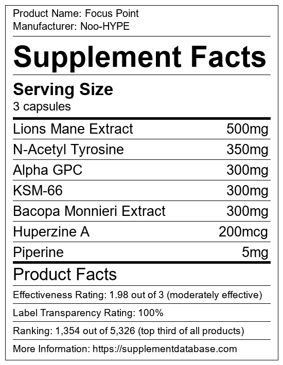 Focus Point is a mood enhancing supplement manufactured by Noo-HYPE. It ranks 21 out of 43 mood enhancing supplements and earned an overall thumbs-up recommendation based on seven factors including nutrition label transparency, ingredients, dosing, claims, research rating, and ranking.