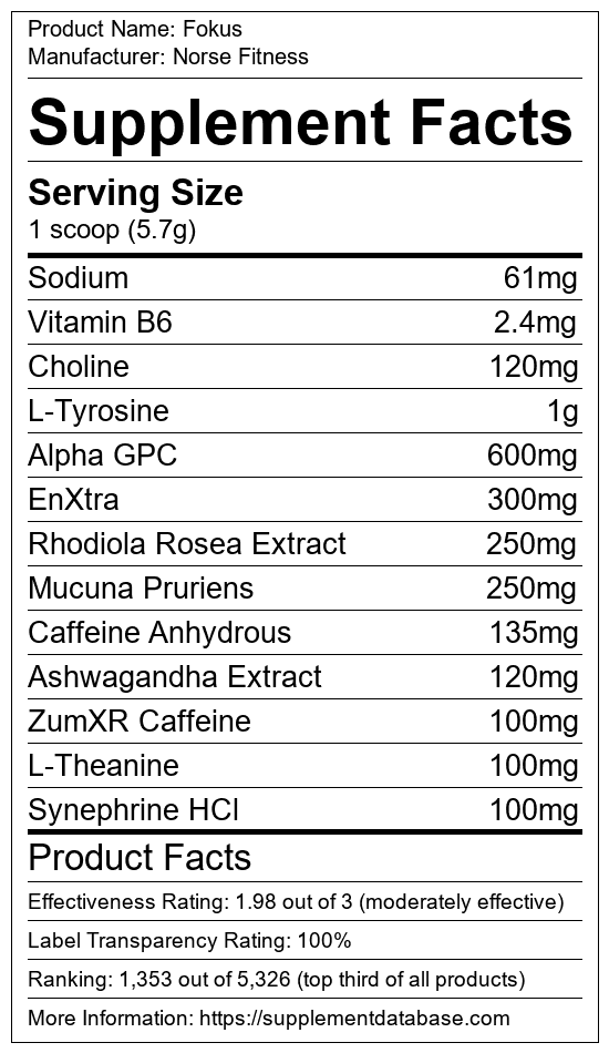 Fokus is a cognitive enhancement supplement manufactured by Norse Fitness. It ranks 44 out of 173 cognitive enhancement supplements and earned an overall thumbs-up recommendation based on seven factors including nutrition label transparency, ingredients, dosing, claims, research rating, and ranking.