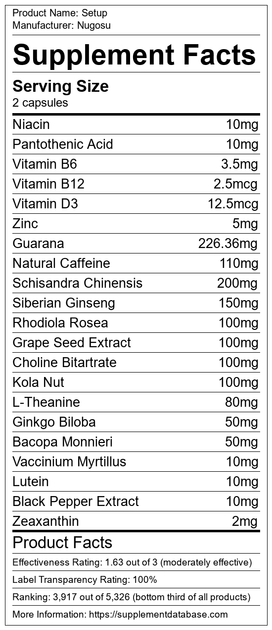 Setup is a cognitive enhancement supplement manufactured by Nugosu. It ranks 128 out of 173 cognitive enhancement supplements and earned an overall thumbs-down recommendation based on seven factors including nutrition label transparency, ingredients, dosing, claims, research rating, and ranking.
