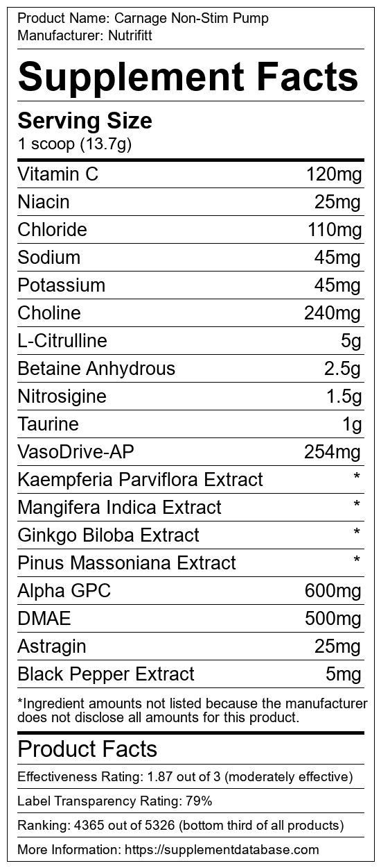 Carnage Non-Stim Pump is a pump supplement manufactured by Nutrifitt. It ranks 299 out of 322 pump supplements and earned an overall thumbs-down recommendation based on seven factors including nutrition label transparency, ingredients, dosing, claims, research rating, and ranking.
