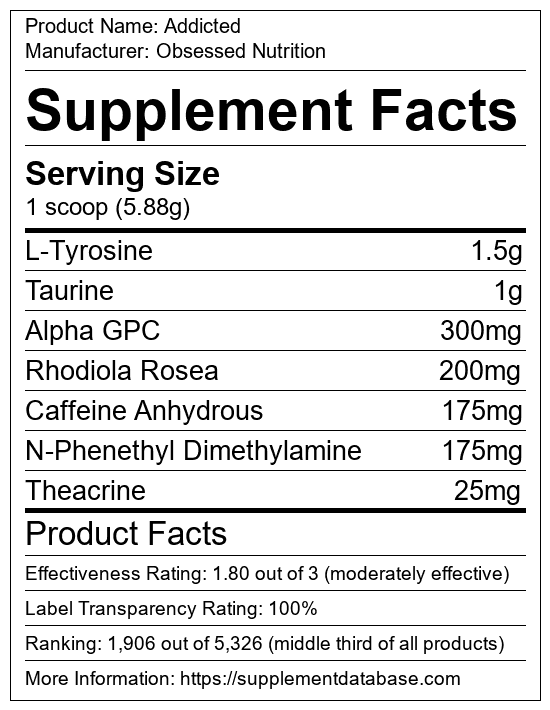 Addicted is a cognitive enhancement supplement manufactured by Obsessed Nutrition. It ranks 61 out of 173 cognitive enhancement supplements and earned an overall thumbs-up recommendation based on seven factors including nutrition label transparency, ingredients, dosing, claims, research rating, and ranking.