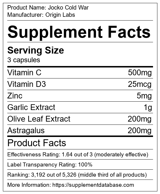 Jocko Cold War is a multivitamin manufactured by Origin Labs. It ranks 33 out of 52 multivitamins and earned an overall thumbs-down recommendation based on seven factors including nutrition label transparency, ingredients, dosing, claims, research rating, and ranking.