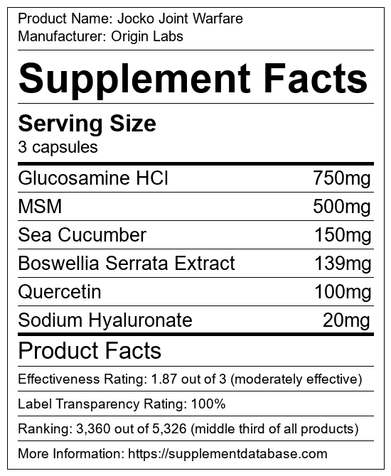 Jocko Joint Warfare is a joint supplement manufactured by Origin Labs. It ranks 72 out of 99 joint supplements and earned an overall thumbs-down recommendation based on seven factors including nutrition label transparency, ingredients, dosing, claims, research rating, and ranking.