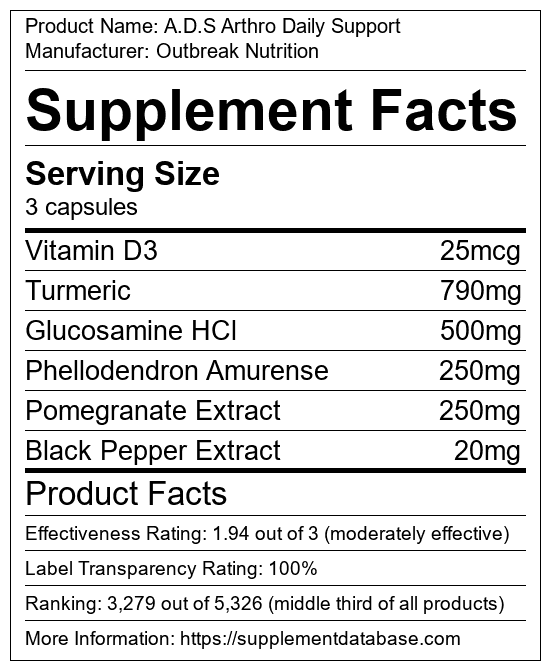 A.D.S Arthro Daily Support is a joint supplement manufactured by Outbreak Nutrition. It ranks 67 out of 99 joint supplements and earned an overall thumbs-down recommendation based on seven factors including nutrition label transparency, ingredients, dosing, claims, research rating, and ranking.