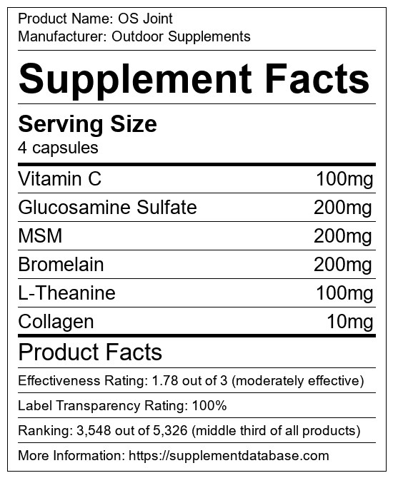 OS Joint is a joint supplement manufactured by Outdoor Supplements. It ranks 80 out of 99 joint supplements and earned an overall thumbs-down recommendation based on seven factors including nutrition label transparency, ingredients, dosing, claims, research rating, and ranking.