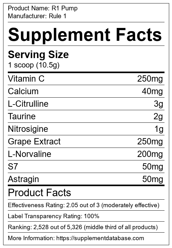 R1 Pump is a pump supplement manufactured by Rule 1. It ranks 180 out of 322 pump supplements and earned an overall thumbs-down recommendation based on seven factors including nutrition label transparency, ingredients, dosing, claims, research rating, and ranking.