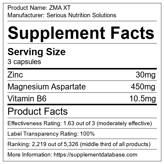 ZMA XT is a multivitamin manufactured by Serious Nutrition Solutions. It ranks 8 out of 52 multivitamins and earned an overall thumbs-up recommendation based on seven factors including nutrition label transparency, ingredients, dosing, claims, research rating, and ranking.