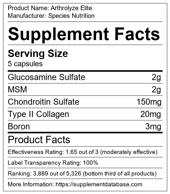 Arthrolyze Elite is a joint supplement manufactured by Species Nutrition. It ranks 90 out of 99 joint supplements and earned an overall thumbs-down recommendation based on seven factors including nutrition label transparency, ingredients, dosing, claims, research rating, and ranking.