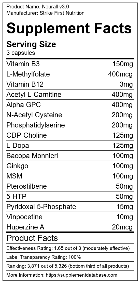 Neurall v3.0 is a cognitive enhancement supplement manufactured by Strike First Nutrition. It ranks 125 out of 173 cognitive enhancement supplements and earned an overall thumbs-down recommendation based on seven factors including nutrition label transparency, ingredients, dosing, claims, research rating, and ranking.