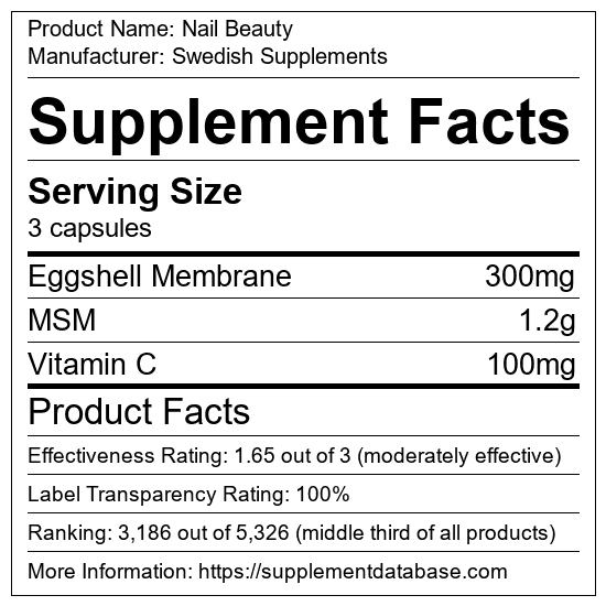 Nail Beauty is a multivitamin manufactured by Swedish Supplements. It ranks 32 out of 52 multivitamins and earned an overall thumbs-down recommendation based on seven factors including nutrition label transparency, ingredients, dosing, claims, research rating, and ranking.