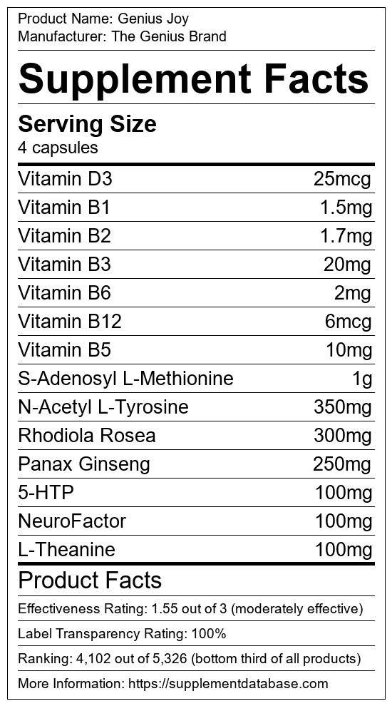 Genius Joy is a mood enhancing supplement manufactured by The Genius Brand. It ranks 36 out of 43 mood enhancing supplements and earned an overall thumbs-down recommendation based on seven factors including nutrition label transparency, ingredients, dosing, claims, research rating, and ranking.