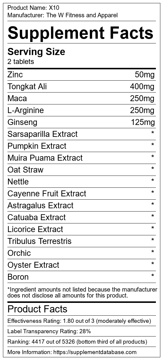 X10 is a male enhancement supplement manufactured by The W Fitness and Apparel. It ranks 29 out of 35 male enhancement supplements and earned an overall thumbs-down recommendation based on seven factors including nutrition label transparency, ingredients, dosing, claims, research rating, and ranking.
