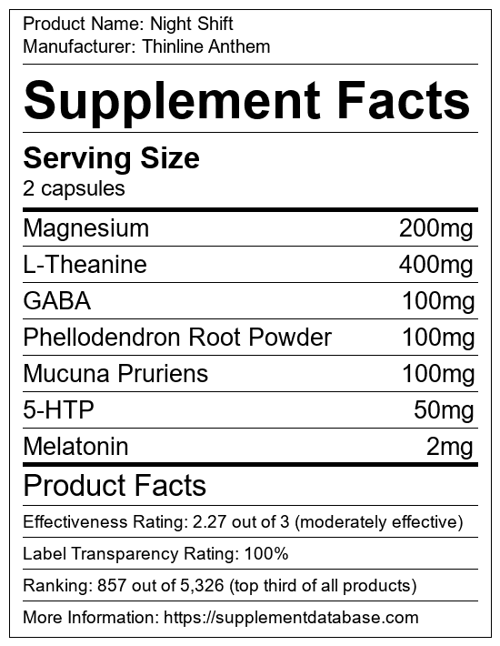 Night Shift is a sleep aid manufactured by Thinline Anthem. It ranks 76 out of 215 sleep aids and earned an overall thumbs-up recommendation based on seven factors including nutrition label transparency, ingredients, dosing, claims, research rating, and ranking.