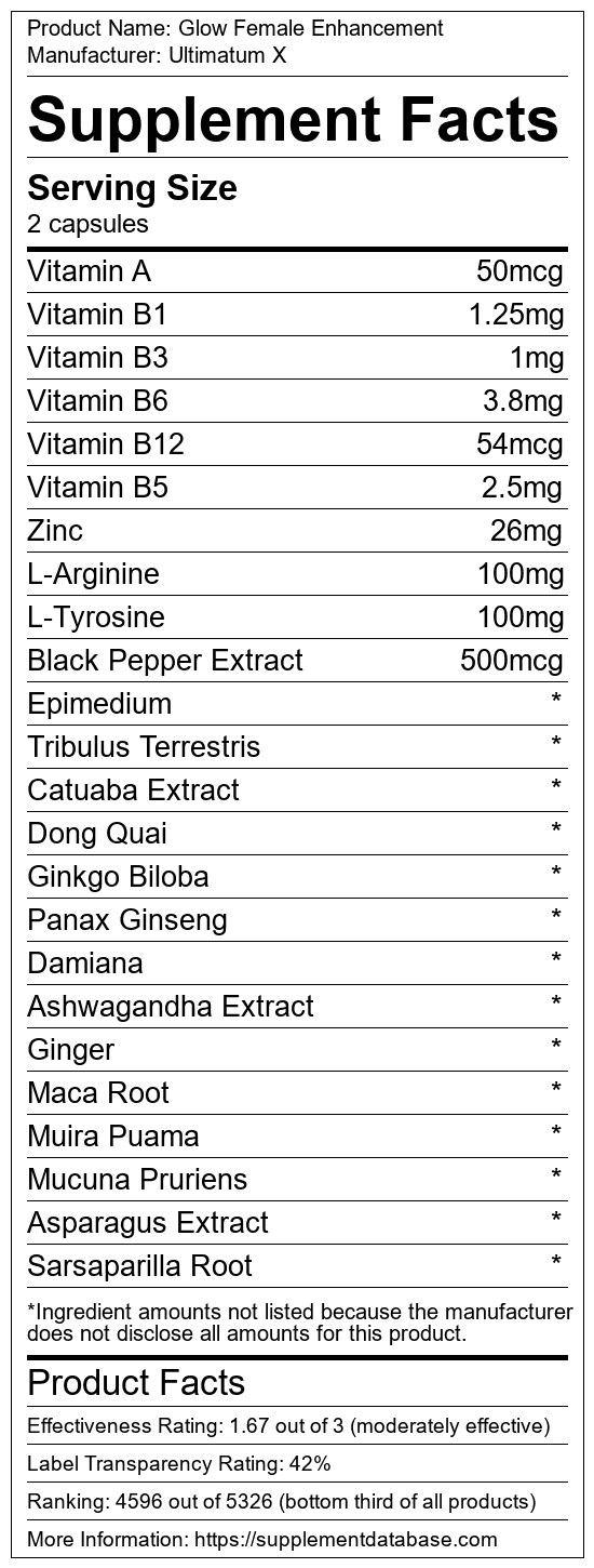 Glow Female Enhancement is a multivitamin manufactured by Ultimatum X. It ranks 49 out of 52 multivitamins and earned an overall thumbs-down recommendation based on seven factors including nutrition label transparency, ingredients, dosing, claims, research rating, and ranking.