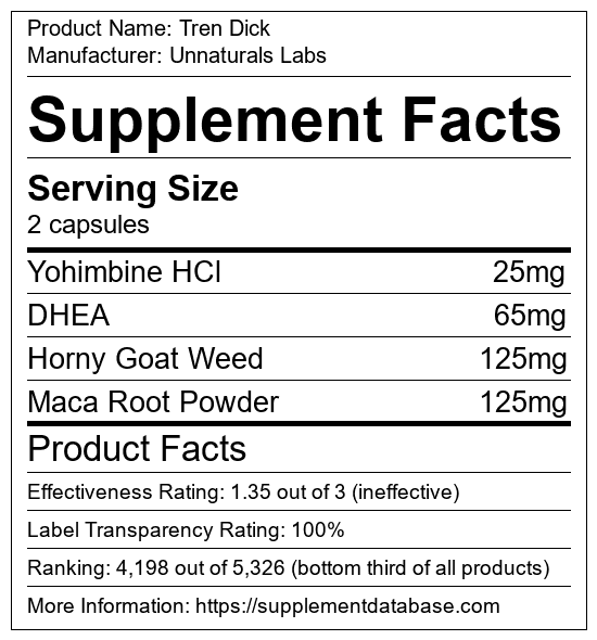 Tren Dick is a male enhancement supplement manufactured by Unnaturals Labs. It ranks 27 out of 35 male enhancement supplements and earned an overall thumbs-down recommendation based on seven factors including nutrition label transparency, ingredients, dosing, claims, research rating, and ranking.
