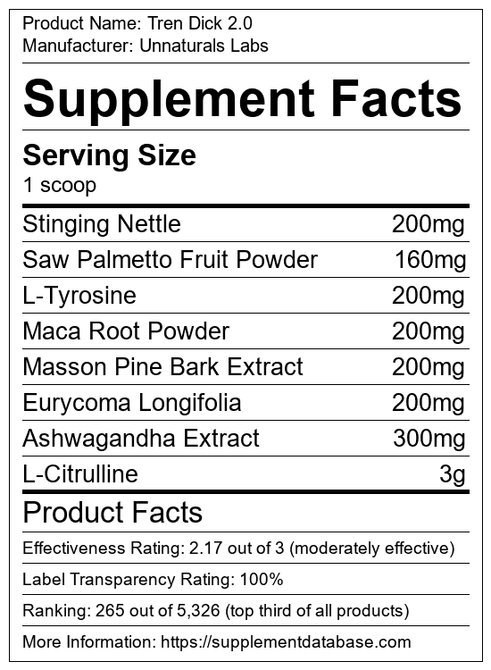 Tren Dick 2.0 is a male enhancement supplement manufactured by Unnaturals Labs. It ranks 1 out of 35 male enhancement supplements and earned an overall thumbs-up recommendation based on seven factors including nutrition label transparency, ingredients, dosing, claims, research rating, and ranking.