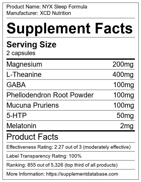 NYX Sleep Formula is a sleep aid manufactured by XCD Nutrition. It ranks 74 out of 215 sleep aids and earned an overall thumbs-up recommendation based on seven factors including nutrition label transparency, ingredients, dosing, claims, research rating, and ranking.