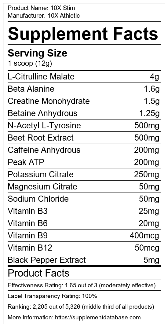 10X Stim is a pre-workout supplement manufactured by 10X Athletic. It ranks 1,054 out of 1,898 pre-workout supplements and earned an overall thumbs-up recommendation based on seven factors including nutrition label transparency, ingredients, dosing, claims, research rating, and ranking.