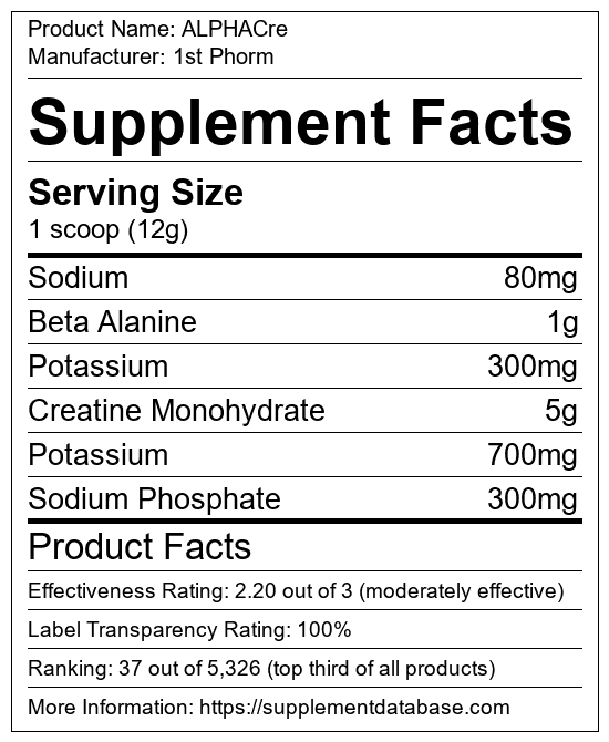 ALPHACre is a pre-workout supplement manufactured by 1st Phorm. It ranks 16 out of 1,898 pre-workout supplements and earned an overall thumbs-up recommendation based on seven factors including nutrition label transparency, ingredients, dosing, claims, research rating, and ranking.