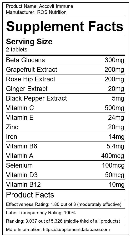 Accovit Immune is an immune system booster manufactured by ROS Nutrition. It ranks 38 out of 72 immune system boosters and earned an overall thumbs-down recommendation based on seven factors including nutrition label transparency, ingredients, dosing, claims, research rating, and ranking.