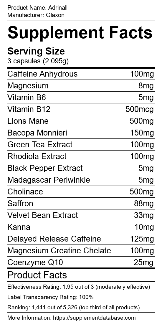 Adrinall is a cognitive enhancement supplement manufactured by Glaxon. It ranks 46 out of 173 cognitive enhancement supplements and earned an overall thumbs-up recommendation based on seven factors including nutrition label transparency, ingredients, dosing, claims, research rating, and ranking.