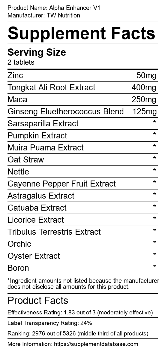 Alpha Enhancer V1 is a testosterone booster manufactured by TW Nutrition. It ranks 126 out of 321 testosterone boosters and earned an overall thumbs-down recommendation based on seven factors including nutrition label transparency, ingredients, dosing, claims, research rating, and ranking.