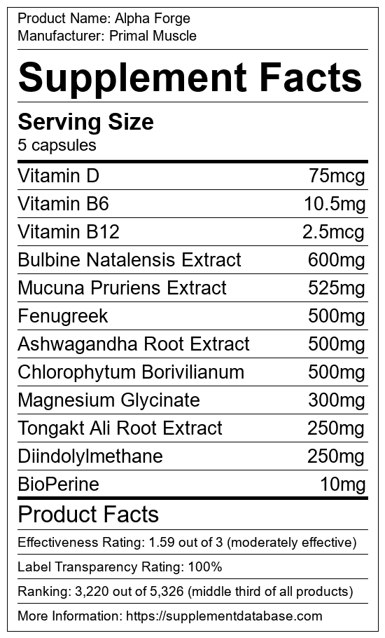 Alpha Forge is a testosterone booster manufactured by Primal Muscle. It ranks 204 out of 321 testosterone boosters and earned an overall thumbs-down recommendation based on seven factors including nutrition label transparency, ingredients, dosing, claims, research rating, and ranking.