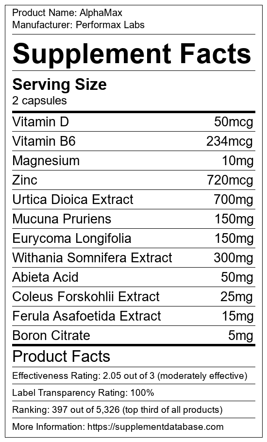 AlphaMax is a testosterone booster manufactured by Performax Labs. It ranks 6 out of 321 testosterone boosters and earned an overall thumbs-up recommendation based on seven factors including nutrition label transparency, ingredients, dosing, claims, research rating, and ranking.