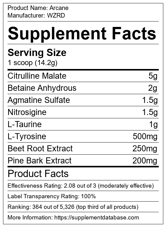 Arcane is a pre-workout supplement manufactured by WZRD. It ranks 152 out of 1,898 pre-workout supplements and earned an overall thumbs-up recommendation based on seven factors including nutrition label transparency, ingredients, dosing, claims, research rating, and ranking.