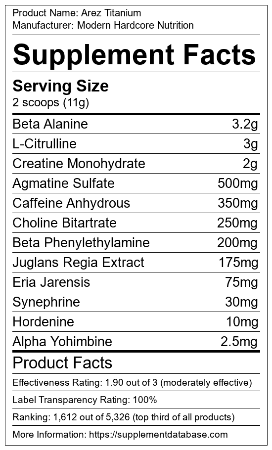 Arez Titanium is a pre-workout supplement manufactured by Modern Hardcore Nutrition. It ranks 709 out of 1,898 pre-workout supplements and earned an overall thumbs-up recommendation based on seven factors including nutrition label transparency, ingredients, dosing, claims, research rating, and ranking.