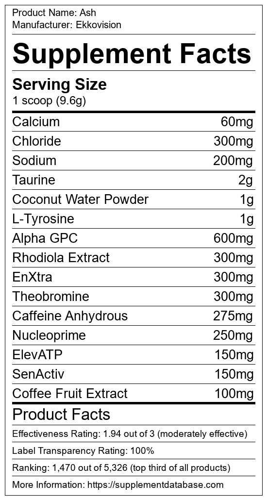 Ash is a pre-workout supplement manufactured by Ekkovision. It ranks 643 out of 1,898 pre-workout supplements and earned an overall thumbs-up recommendation based on seven factors including nutrition label transparency, ingredients, dosing, claims, research rating, and ranking.