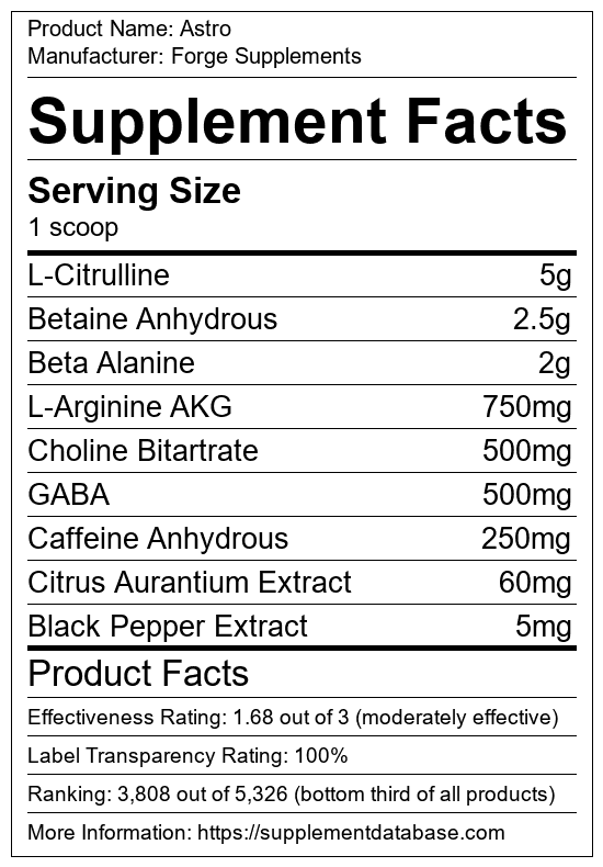 Astro is a pre-workout supplement manufactured by Forge Supplements. It ranks 1,557 out of 1,898 pre-workout supplements and earned an overall thumbs-down recommendation based on seven factors including nutrition label transparency, ingredients, dosing, claims, research rating, and ranking.