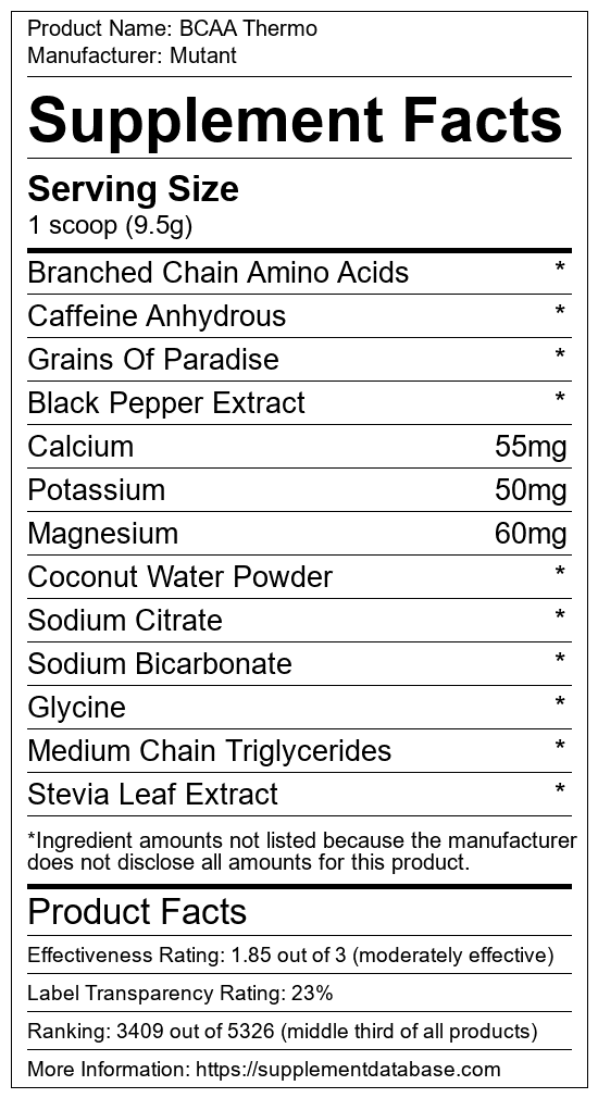 BCAA Thermo is a post-workout supplement manufactured by Mutant. It ranks 361 out of 515 post-workout supplements and earned an overall thumbs-down recommendation based on seven factors including nutrition label transparency, ingredients, dosing, claims, research rating, and ranking.