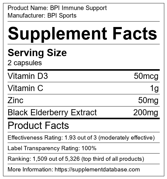BPI Immune Support is an immune system booster manufactured by BPI Sports. It ranks 7 out of 72 immune system boosters and earned an overall thumbs-up recommendation based on seven factors including nutrition label transparency, ingredients, dosing, claims, research rating, and ranking.