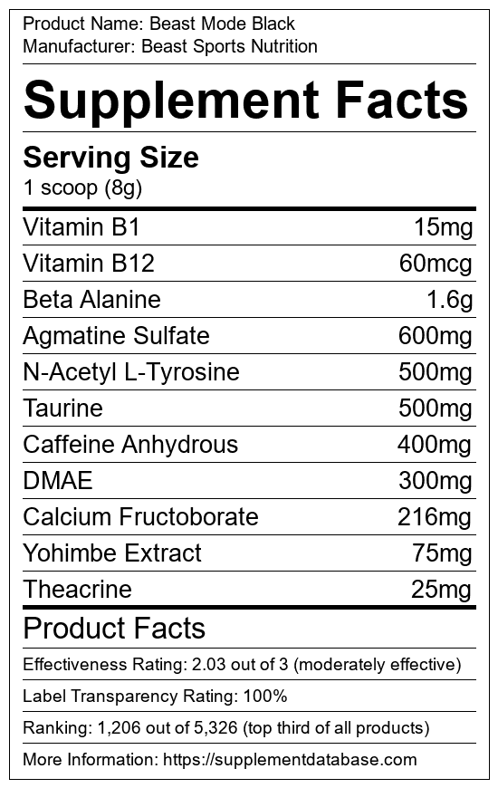 Beast Mode Black is a pre-workout supplement manufactured by Beast Sports Nutrition. It ranks 532 out of 1,898 pre-workout supplements and earned an overall thumbs-up recommendation based on seven factors including nutrition label transparency, ingredients, dosing, claims, research rating, and ranking.