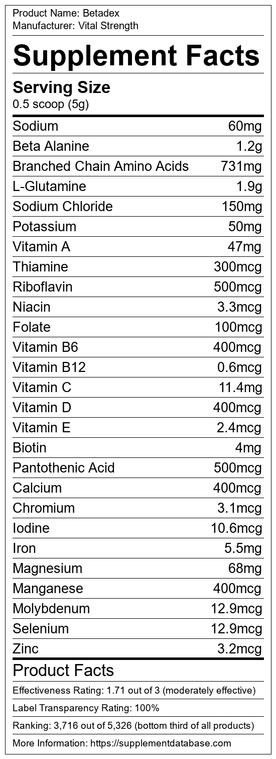 Betadex is an intra-workout supplement manufactured by Vital Strength. It ranks 275 out of 339 intra-workout supplements and earned an overall thumbs-down recommendation based on seven factors including nutrition label transparency, ingredients, dosing, claims, research rating, and ranking.