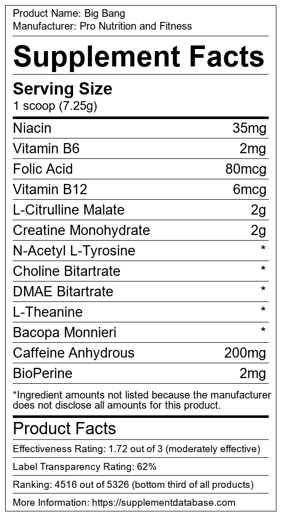 Big Bang is a pre-workout supplement manufactured by Pro Nutrition and Fitness. It ranks 1,792 out of 1,898 pre-workout supplements and earned an overall thumbs-down recommendation based on seven factors including nutrition label transparency, ingredients, dosing, claims, research rating, and ranking.
