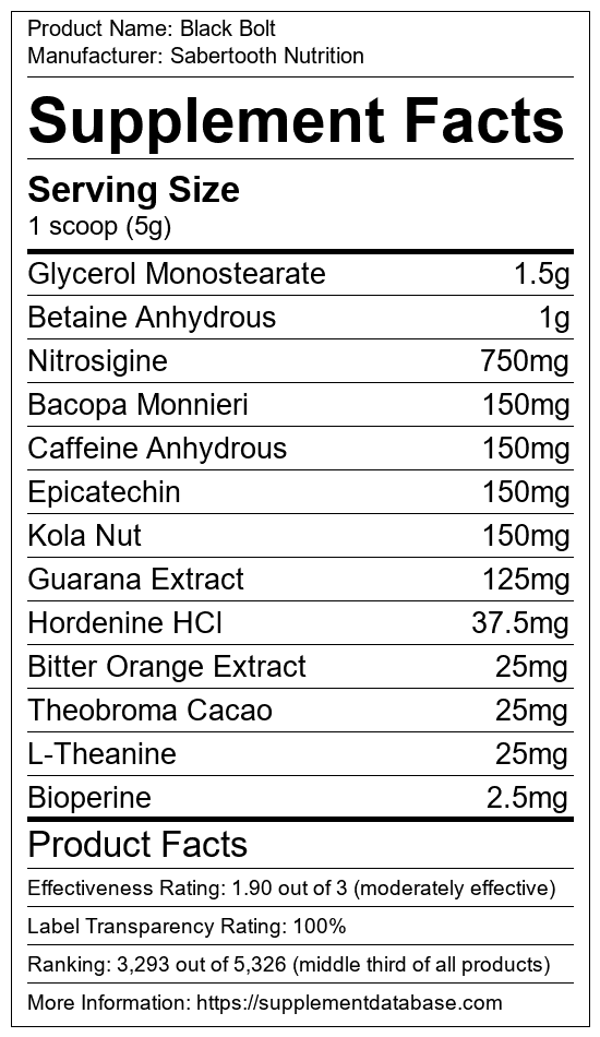 Black Bolt is a pre-workout supplement manufactured by Sabertooth Nutrition. It ranks 1,270 out of 1,898 pre-workout supplements and earned an overall thumbs-down recommendation based on seven factors including nutrition label transparency, ingredients, dosing, claims, research rating, and ranking.