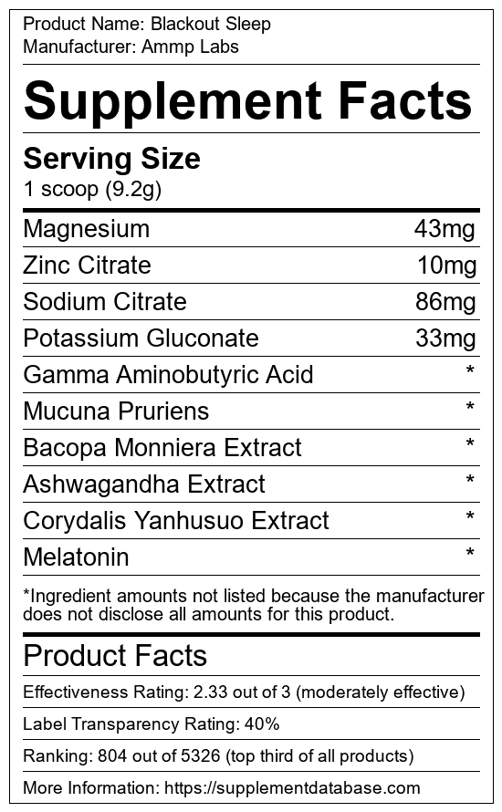 Blackout Sleep is a sleep aid manufactured by Ammp Labs. It ranks 64 out of 215 sleep aids and earned an overall thumbs-up recommendation based on seven factors including nutrition label transparency, ingredients, dosing, claims, research rating, and ranking.