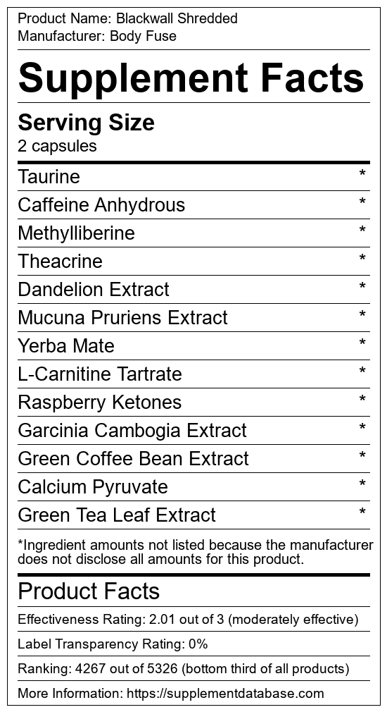 Blackwall Shredded is a fat burning supplement manufactured by Body Fuse. It ranks 584 out of 719 fat burning supplements and earned an overall thumbs-down recommendation based on seven factors including nutrition label transparency, ingredients, dosing, claims, research rating, and ranking.
