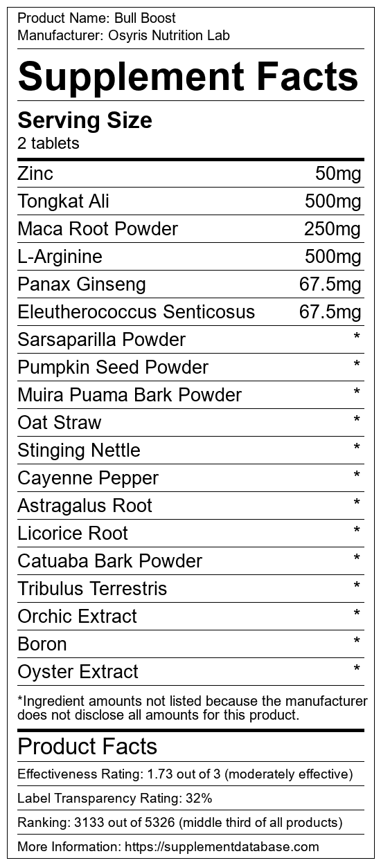 Bull Boost is a testosterone booster manufactured by Osyris Nutrition Lab. It ranks 167 out of 321 testosterone boosters and earned an overall thumbs-down recommendation based on seven factors including nutrition label transparency, ingredients, dosing, claims, research rating, and ranking.