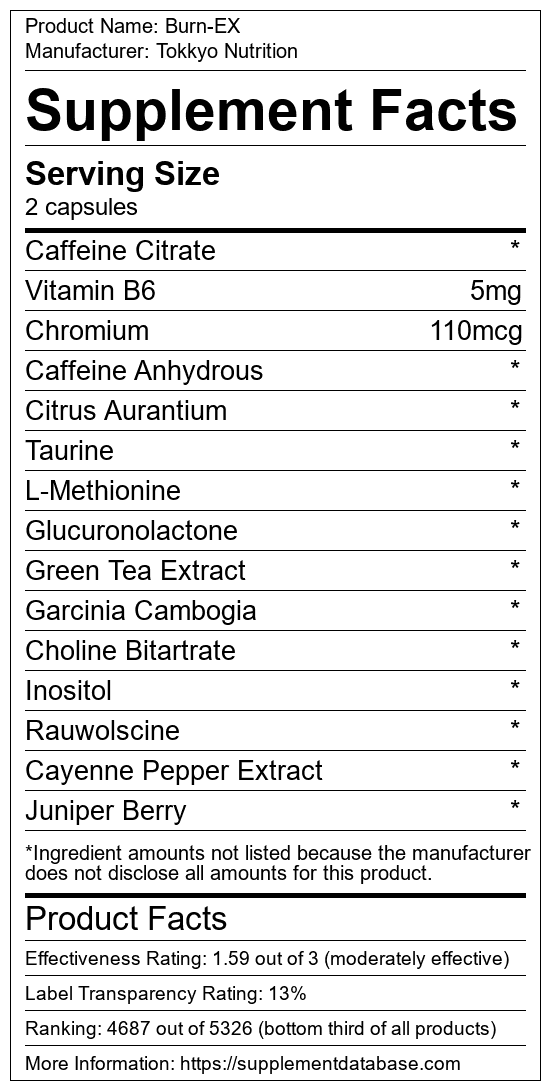 Burn-EX is a fat burning supplement manufactured by Tokkyo Nutrition. It ranks 684 out of 719 fat burning supplements and earned an overall thumbs-down recommendation based on seven factors including nutrition label transparency, ingredients, dosing, claims, research rating, and ranking.