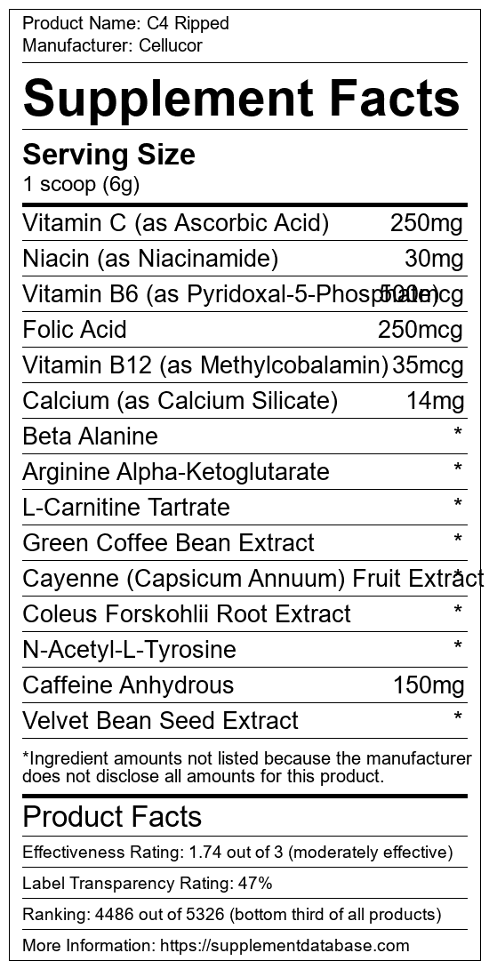 C4 Ripped is a pre-workout supplement manufactured by Cellucor. It ranks 1,775 out of 1,898 pre-workout supplements and earned an overall thumbs-down recommendation based on seven factors including nutrition label transparency, ingredients, dosing, claims, research rating, and ranking.